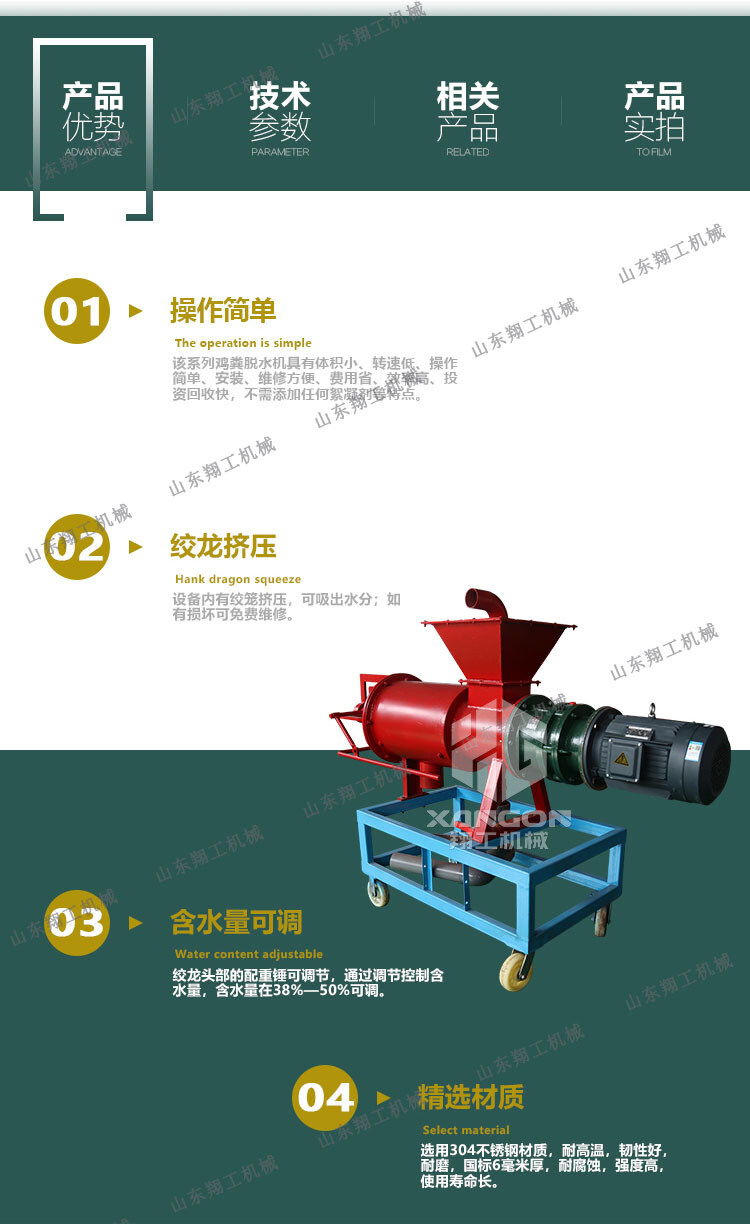 該系列雞糞脫水機具有體積小、轉(zhuǎn)速低、操作簡單、安裝、維修方便、費用省、效率高、投資回收快,不需添加任何絮凝劑等特點;該機采用的螺旋軸、篩網(wǎng)為不銹鋼制作;禽畜類糞便處理機能將雞糞、牛糞、豬糞等禽畜糞便原糞水分離為液態(tài)有機肥和固態(tài)有機肥;液態(tài)有機肥可直接用于農(nóng)作物利用吸收;固態(tài)有機肥可運到缺肥地區(qū)使用,也可起到改觀土壤結構的作用,同時經(jīng)過處理可制成有機復合肥。